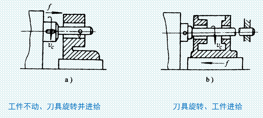 車床上鏜孔:工件旋轉(zhuǎn)、鏜刀進(jìn)給,如圖下圖所示: