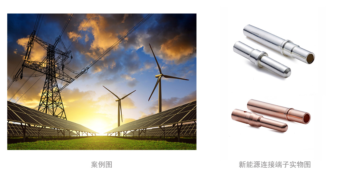 新能源連接端子:用于風(fēng)能發(fā)電、大型光伏地面電站等逆變器中的連接器。使用材料C14500碲銅,產(chǎn)品表面鍍錫,接觸電阻小于0.5mΩ以下,使用中具有溫升低,插拔力穩(wěn)定,抗震性強(qiáng)等特性。